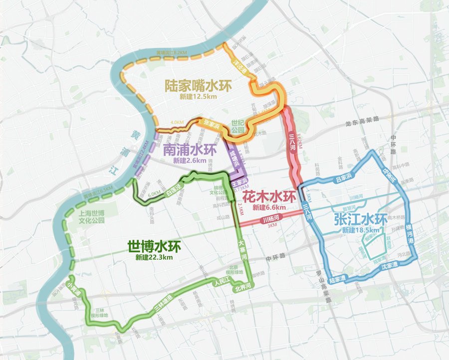 前不久,在陆家嘴水环靠近上海证券交易大楼新楼附近,记者遇到了一位年轻白领,他说,从向城路地铁站2号口出来,明明可以有更近的路,但就是非常喜欢水环沿着张家浜这一带的风光,从这条路走“心情舒畅。”作为一项重大民生工程,很多浦东人眼中,陆家嘴水环的核心价值在于它为这座高速运转的金融引擎,安装了一个可以深呼吸的“绿肺”,开辟了一条可供心灵栖息的“慢行道”。今年,浦东又启动了世博水环的建设,再加上张江水环、南浦水环、花木水环等正在建设的滨水步道、水带,浦东人民从此有了自己的“五环”。从地图上看,“五环”水脉位于浦东核心区段,环内总面积约199.4平方公里,覆盖13个街镇,辐射人口约230万。“五环”宛如一条丝带,将城市里的几大重要板块,以及生活在这里的各类人群、各种功能建筑都“围”了起来。并在面向各类需求中,被赋予了各自独特的功能价值。