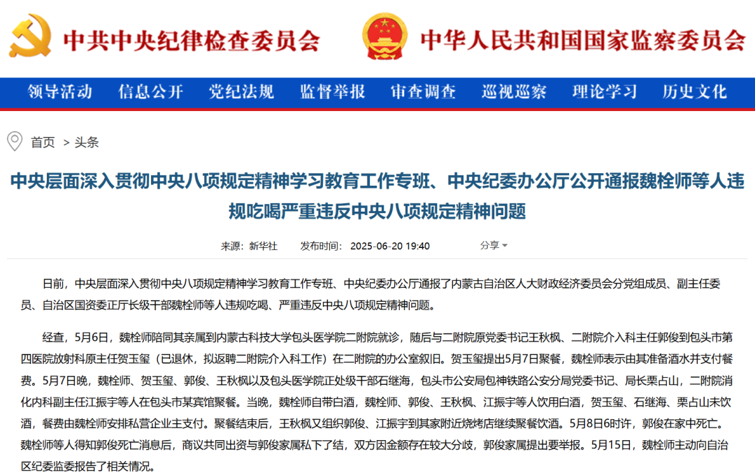 今年6月,中央层面深入贯彻中央八项规定精神学习教育工作专班、中央纪委办公厅公开通报魏栓师等人违规吃喝、严重违反中央八项规定精神问题。
