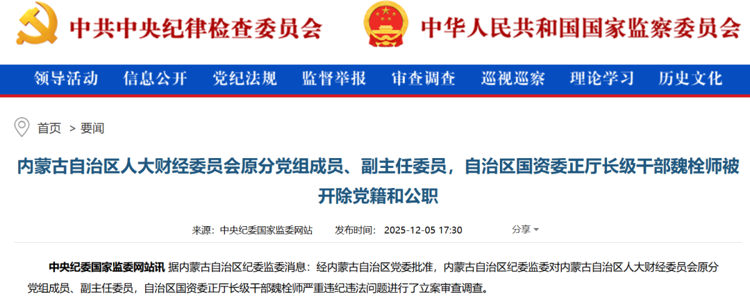 12月5日,中央纪委国家监委官网通报:内蒙古自治区人大财经委员会原分党组成员、副主任委员,自治区国资委正厅长级干部魏栓师被开除党籍和公职。
