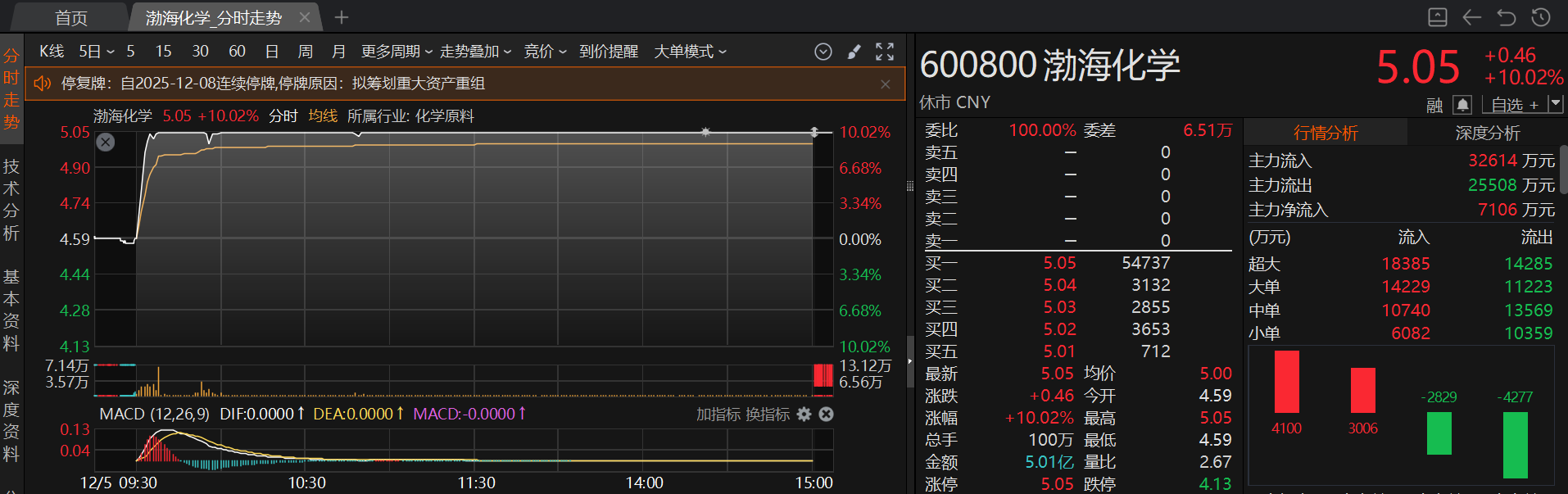 渤海化学周五晚间公告称,公司正在筹划出售天津渤海石化有限公司100%股权、通过发行股份及支付现金的方式购买安徽泰达新材料股份有限公司的控制权。本次交易预计构成重大资产重组,不会导致公司实际控制人变更,不构成重组上市。为维护投资者利益,避免造成股价异常波动,公司股票自2025年12月8日起开始停牌,预计停牌时间不超过10个交易日。停牌期间,公司将积极推进交易各项工作,及时履行信息披露义务。值得注意的是,渤海化学周五收盘股价涨停。