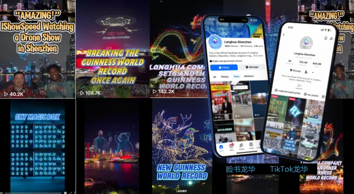 深圳大漠大智控有限公司是诞生于深圳龙华的中国无人机编队表演领域的领军企业。2024年以来,大漠大多次以万架级无人机表演连续刷新吉尼斯世界纪录,在国内获新华社、央视《新闻联播》等权威媒体集中报道,并多次登上各大社交平台热搜。在海外,其表演视频获马斯克三度点赞、华春莹全球推介,并对史蒂芬·库里等国际名人中国行大漠大表演活动进行联动传播,实现从国内主流认可到全球现象级传播的全面覆盖。依托“脸书龙华”“TikTok龙华”等国际传播矩阵,助力其实现从技术出海到文化输出的全球传播跨越。目前,大漠大累计全球执飞超50个国家,完成上万场表演,以“科技+文化”的创新表达与深度融合,迅速点燃海外社交媒体,成为国家形象塑造的创新载体,实现了从民间到官方、海内到海外、从科技圈到大众圈层的现象级破圈传播。