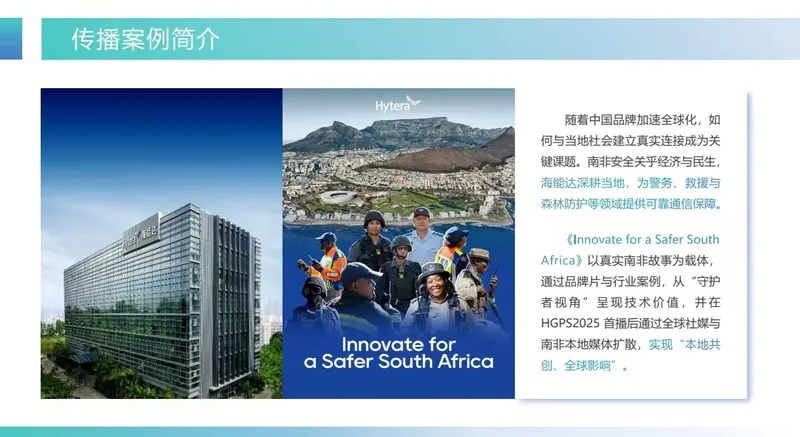 《Innovate for a Safer South Africa》是一项以真实案例为核心的国际传播项目,通过短视频、稿件、峰会等形式立体传播触达。主旨及案例系列视频通过纪录式故事呈现海能达通信技术在南非公共安全体系中的巨大社会价值。项目以“守护者视角”取代传统产品叙事,与城市警务团队、应急救援队、消防员护林员一道,见证通信技术如何赋能城市救援与社会治安、森林防火、野生动物保护。该传播项目以一支品牌主片串联多个垂直行业案例,品牌片在海能达全球合作伙伴峰会(HGPS2025)首播,结合社媒发布、稿件传播等形式,形成“理念-实践-国际传播”的完整传播链路,并在南非本地媒体和目标受众中广泛曝光,实现“本地共创、全球传播”(be global,golocal)。