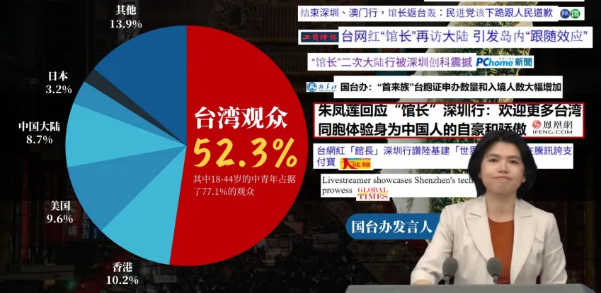 2025年8月,雅文传播作为策划单位推动的中国台湾网红“馆长”深圳行,通过连续多日的实时直播,向两岸观众生动展现了深圳作为全球瞩目“科技之都”的创新活力与城市魅力。此次活动中,馆长深度体验了大疆无人机、无人驾驶出租车、智能机器人泡茶等前沿科技,并在人才公园观看了2000架无人机编队呈现的震撼表演。其直播以无滤镜的真实视角,打破了中国台湾同胞对大陆的刻板印象,直播评论区充满了“两岸一家亲”和期盼统一的热烈呼声,有效促进了两岸民心的亲近。