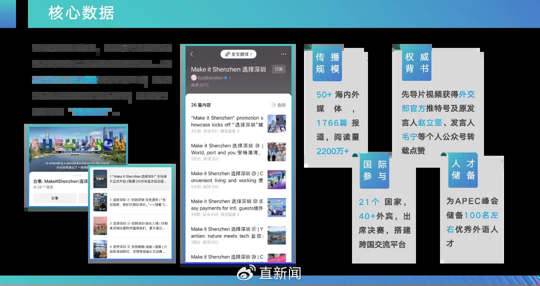 为加强城市品牌形象塑造和综合营销,吸引国际投资、高端人才、国际创新项目等全球优质要素在深圳加速集聚,深圳市委组织部会同宣传、外办、投促、文体等多个部门,以深圳迎接APEC为契机,组织策划“选择深圳”外语“双招双引”综合能力竞赛,引导各单位公共管理者们化身“城市推介官”开展灵活多元的城市宣介,以短视频和文字报道相结合的形式向全球推介深圳。该系列视频由各单位青年公务员和生活在深圳的外国青年等共同出镜拍摄,分享他们在深圳的真实体验与生活点滴,向全球观众展示深圳多维度的城市景观与服务,并邀请海内外每一位朋友来深圳打卡、体验服务、为深圳代言,共同成为这座城市主角,构建了“官方+青年+国际”三位一体的城市宣传推介人才体系,让世界提前感受一座为APEC准备好也为世界准备好的深圳,让世界看到粤港澳大湾区的创新与活力。