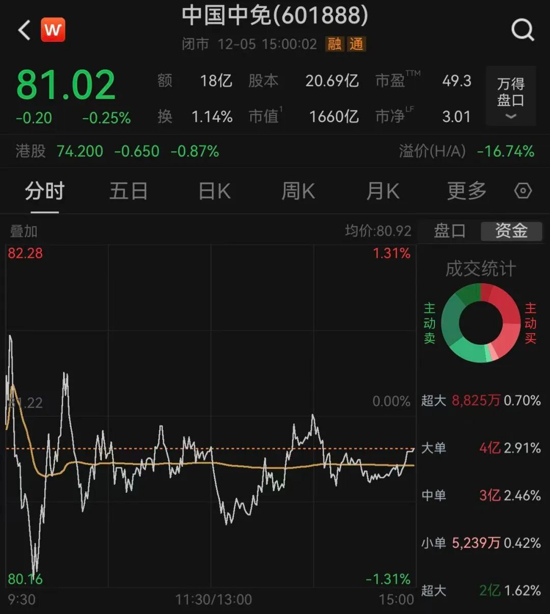 2009年,中国中免在上交所挂牌上市,发行价为11.78元/股。上市16年以来,中国中免股价最高时一度超过400元/股,被誉为“免税茅”。受业绩拖累,近几年来,中国中免在二级市场表现也较为低迷,12月5日最新股价收报81.02元/股,总市值1676亿元,较2021年的7400亿市值高点已跌超七成。