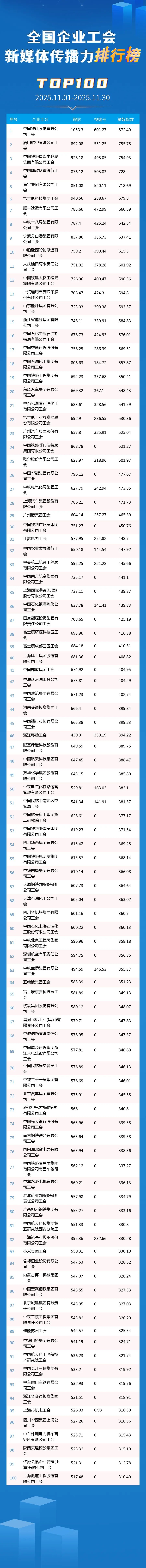 11月榜单发布全国企业工会新媒体传播力排行榜TOP100