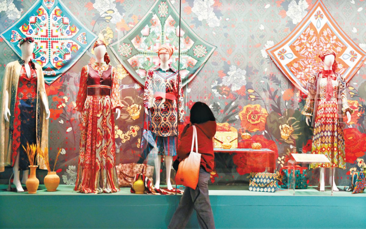 抬头看,悬挂在展厅天花板的艾德莱斯绸斑斓夺目,这一极具地域特色的装饰成为展览中最“出片”的位置之一;展柜里,艾德莱斯绸制成的服装、帽子、领带、钱包、扇子等多种类产品琳琅满目。