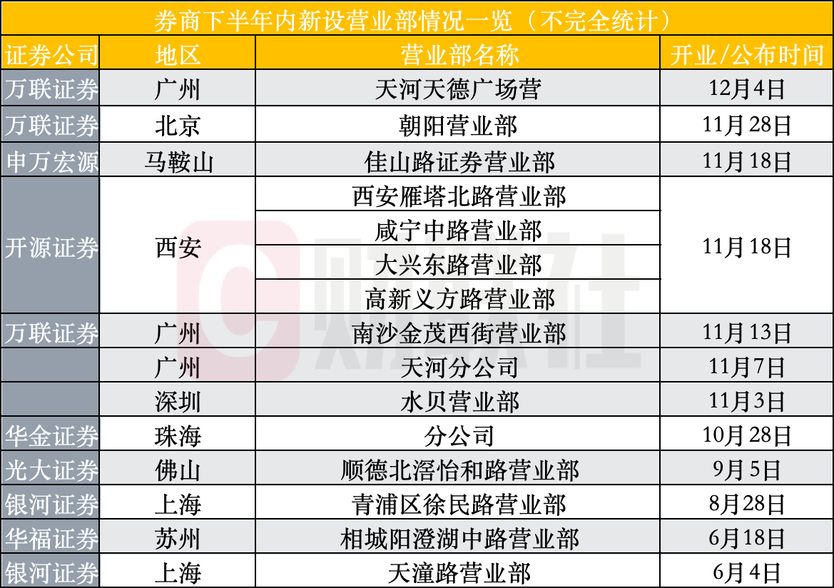 行业动态显示,券商线下新设网点布局动作明显增多。据财联社记者不完全统计,下半年以来,至少包括万联证券、申万宏源、开源证券、华金证券、光大证券、银河证券、华福证券等7家券商共计新设15家分支机构。其中,万联证券新设数量最多,新增5家;其次为开源证券集中新设4家。剩余5家券商则是小幅扩张,除银河证券新设2家网点外,其余均新增1家。