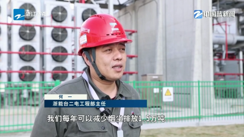 浙能台二电工程部主任 何一:3号机组每年可以发50亿度电,跟同类型机组比起来,我们每年可以减少烟尘排放1.5万吨,减少二氧化碳排放将近有8万吨。