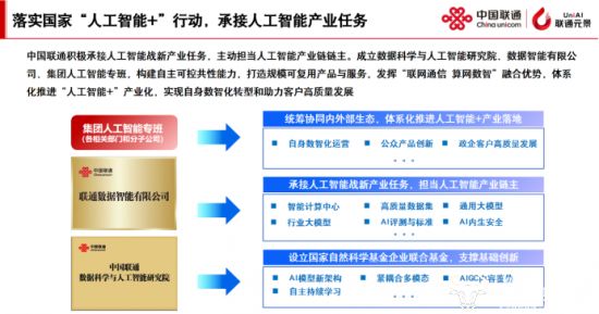 国务院《关于深入实施“人工智能+”行动的意见》明确要求加快人工智能产业化应用,培育新质生产力。中国联通成立数据科学与人工智能研究院、联通数智公司及集团人工智能专班,构建自主可控共性能力,打造可规模复用的产品与服务,全力推进人工智能与实体经济深度融合。
