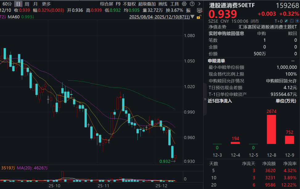 港股新消费亦小幅收红,港股通消费50ETF(159268)两连阴后反弹收涨0.32%,全天成交额超3000万元!资金面上,全天再度“吸金”500万份,已连续第3日净流入,规模同类持续领先!港股新消费概念股多数飘红:李宁涨超3%,百胜中国涨超2%,安踏体育涨超1%,泡泡玛特、海尔智家、华润啤酒微涨(成分股仅做展示,不作为个股推介)。