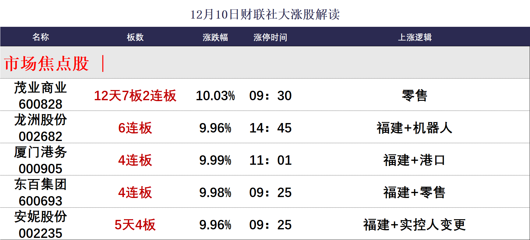 财联社12月10日讯,今日57股涨停,28股炸板,封板率为67%,龙洲股份6连板,东百集团、厦门港务4连板,永辉超市、博纳影业、中瓷电子、再升科技3连板,茂业商业12天7板,安妮股份5天4板。市场探底回升,三大指数涨跌不一,深成指、创业板指盘中先后翻红,创业板指此前一度跌超2%。沪深两市成交额1.78万亿,较上一个交易日缩量1254亿。盘面上,市场热点快速轮动,全市场超2800只个股下跌。板块方面,海南、贵金属、零售等板块涨幅居前,培育钻石、银行、有机硅等板块跌幅居前。截至收盘,沪指跌0.23%,深成指涨0.29%,创业板指跌0.02%。