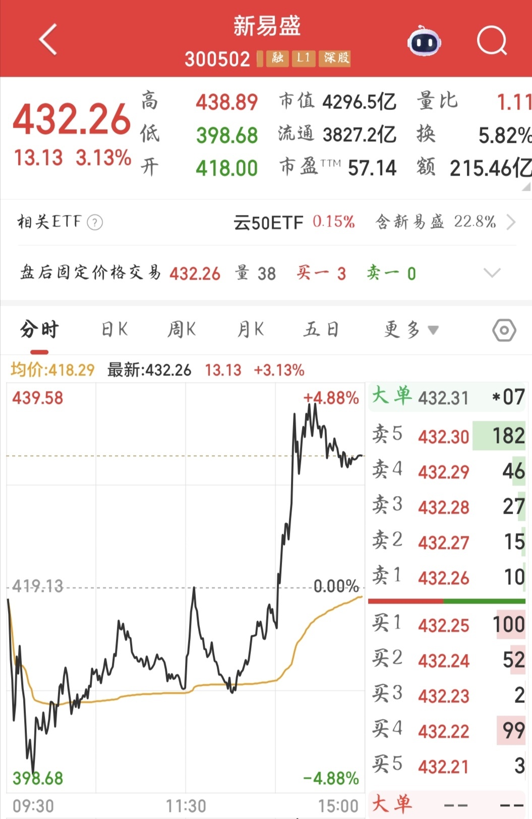12月10日,A股走出探底回升的震荡行情,沪指微跌0.23%报3900.5点,深证成指逆势涨0.29%报收13316.42点;创业板指跌0.02%,报收3209点。全市场成交额1.79万亿元,较前一日1.92万亿元的成交额缩量1260亿元,上涨个股数量达2400余只。盘中最亮眼的莫过于川股龙头新易盛的表现,作为CPO领域巨头,新易盛午后股价涨超3%,最高触及438.89元,最终以432.26元的收盘价再创新高,总市值近4300亿元,成为震荡行情中川股“最靓的仔”。