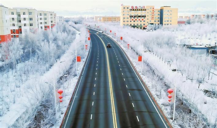 航拍十二师西山农牧场雾凇美景(摄于12月3日)。近年来,十二师打出生态环保“组合拳”,区域空气质量优良天数比例不断上升。马欣 摄