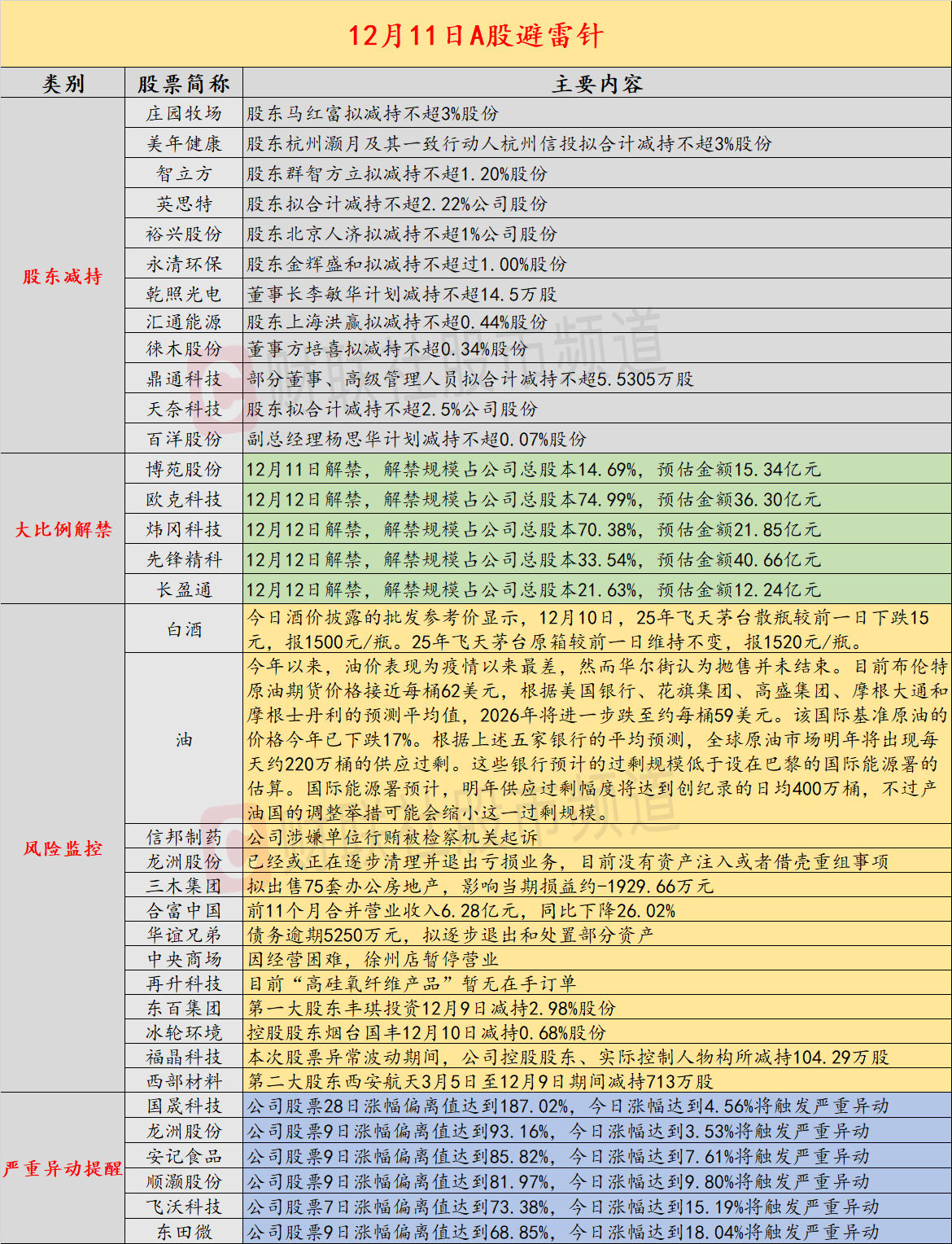 导读:财联社12月11日投资避雷针,近日,A股及海外市场潜在风险事件如下。国内经济信息方面包括:1)茅台回归指导价,25年飞天散瓶批价跌至1500元;2)2026年揽储“开门红”氛围不似往年“火热”;公司方面重点关注包括:1)信邦制药公告,公司涉嫌单位行贿被检察机关起诉;2)6连板龙洲股份表示,已经或正在逐步清理并退出亏损业务,目前没有资产注入或者借壳重组事项;海外市场重点关注包括:1)华尔街认为原油抛售远未结束,明年将因供应过剩而继续下跌;2)美国就业成本增长速度降至2021年中以来最低。