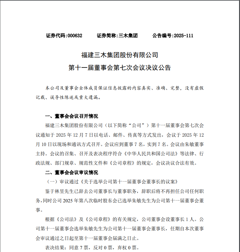 另一则公告表示,公司第十一届董事会第七次会议于2025年12月10日召开,会议选举朱敏为公司第十一届董事会董事长。