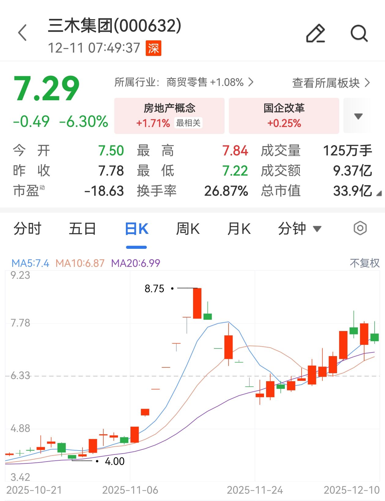股价方面,三木集团11月至今股价呈剧烈震荡态势,11月上旬连续涨停,7个交易日涨幅达94.88%,股价几近翻倍。11月17日触及8.75元阶段性高点后快速回调,多日出现跌停。