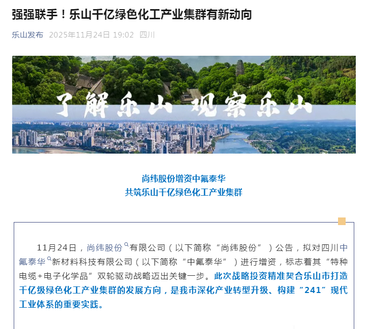 本次投资亦与地方产业发展规划相协同。11月24日,乐山市政府融媒体“乐山发布”发文,“此次战略投资精准契合乐山市打造千亿级绿色化工产业集群的发展方向,是我市深化产业转型升级、构建‘241’现代工业体系的重要实践”。尚纬股份此次增资中氟泰华,深度切入电子化学品及关键基础化学品领域,不仅拓展了企业自身的发展边界,更有效贯通了该市从基础化工原料到高附加值电子化学品的完整产业链条。