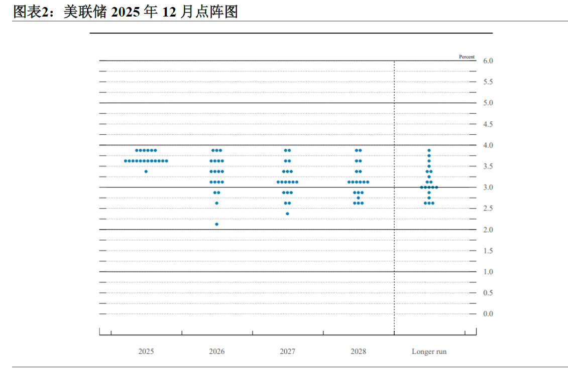 投资者关注的焦点已转向后续政策路径。粤开证券指出,点阵图中位数维持2026年仅降息一次,但官员分歧仍然严重。利率和点阵图方面,2025-2028年利率中位数预测保持不变,仍预计2026年仅有1次降息,2027年再降息1次,长期利率水平预测保持为3.0%。但点阵图显示官员分歧仍然严重,19位官员中,预计2026年加息1次、不降息、降息1次和降息超过1次的官员分别为3位、4位、4位和8位。