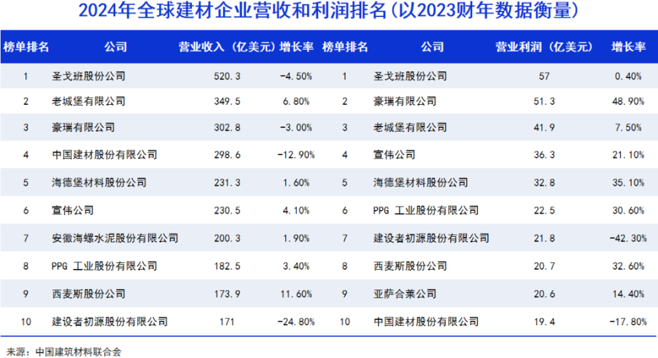 国内规模最大的中国建材,营收排名全球第四,但利润只能排在第十名。对比来看,营业利润超过20亿美元的公司均来自欧洲和北美。圣戈班1.7倍于中国建材的收入,创造了后者3倍体量的利润,充分显示了这家已经年满360岁公司的实力。
