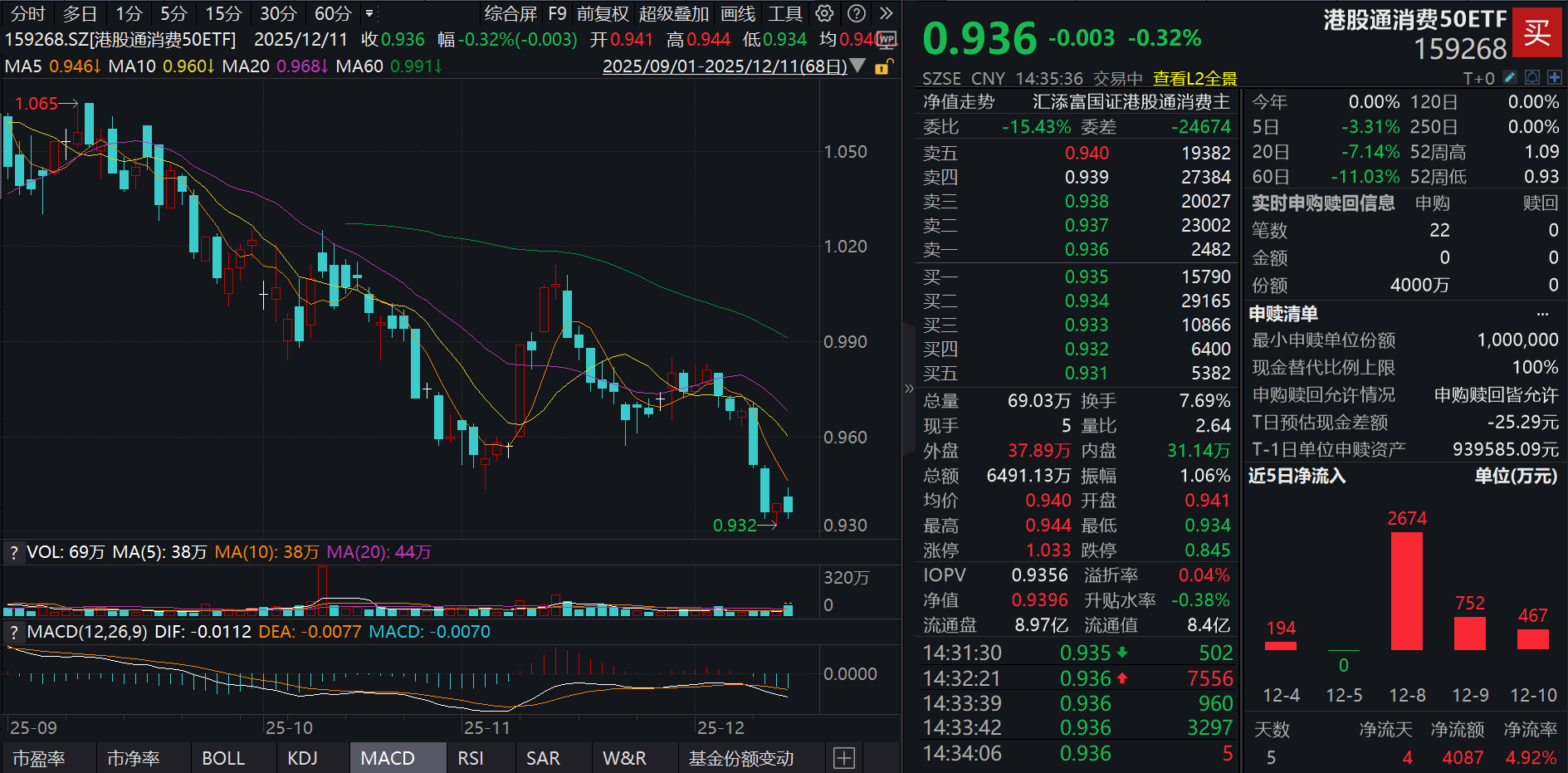 港股新消费亦小幅回调,港股通消费50ETF(159268)回调0.32%,盘中成交额超6500万元!资金面上,盘中再度“吸金”4000万份,已连续第4日大举净流入,规模同类持续领先!港股新消费概念股涨跌互现:巨子生物跌超4%,安踏体育、农夫山泉跌超1%;上涨方面,思摩尔国际涨近7%,老铺黄金涨超3%,万州国际涨超2%,泡泡玛特涨近2%(成分股仅做展示,不作为个股推介)。