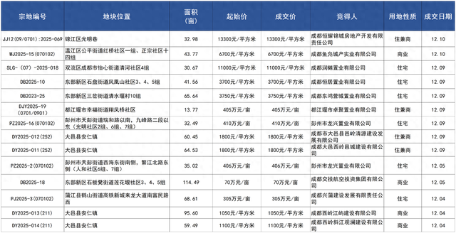 据成都市公共资源交易服务中心,本周,大成都范围内共成交14宗住宅、商业用地,面积合计约759.07亩,主要位于成都二、三圈层,均为底价成交。其中位于锦江区光明巷的一宗约33亩的商住地,被锦江统建底价竞得,其中商服部分的成交楼面价为6586元/㎡,而住宅部分的成交楼面价则为20017元/㎡。