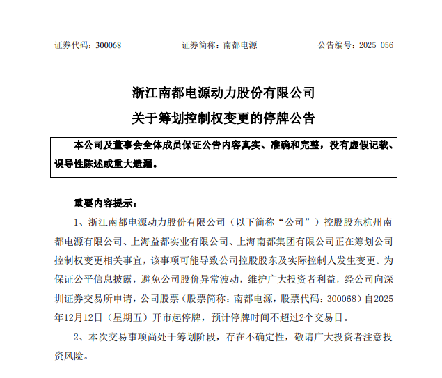 12月11日晚间,南都电源(300068.SZ)发布公告称,公司控股股东杭州南都电源有限公司、上海益都实业有限公司、上海南都集团有限公司正在筹划公司控制权变更相关事宜,可能导致公司控股股东及实际控制人发生变更。为保证公平信息披露,避免公司股价异常波动,经公司向深圳证券交易所申请,公司股票自2025年12月12日开市起停牌,预计停牌时间不超过2个交易日。本次交易事项尚处于筹划阶段,存在不确定性。停牌期间,公司将根据相关事项进展情况及时履行信息披露义务。