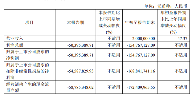 2025年前三季度,公司实现营业收入200万元,同比下滑47.37%;归属于上市公司股东的净利润-1.55亿元;归属于上市公司股东的扣除非经常性损益的净利润-1.69亿元;经营活动产生的现金流量净额为-1.72亿元。