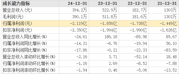 首药控股近年连续亏损,2021年至2024年,公司归属于上市公司股东的净利润分别为-1.449亿元、-1.738亿元、-1.856亿元、-2.119亿元,归属于上市公司股东的扣除非经常性损益的净利润分别为-1.626亿元、-1.990亿元、-1.994亿元、-2.350亿元。