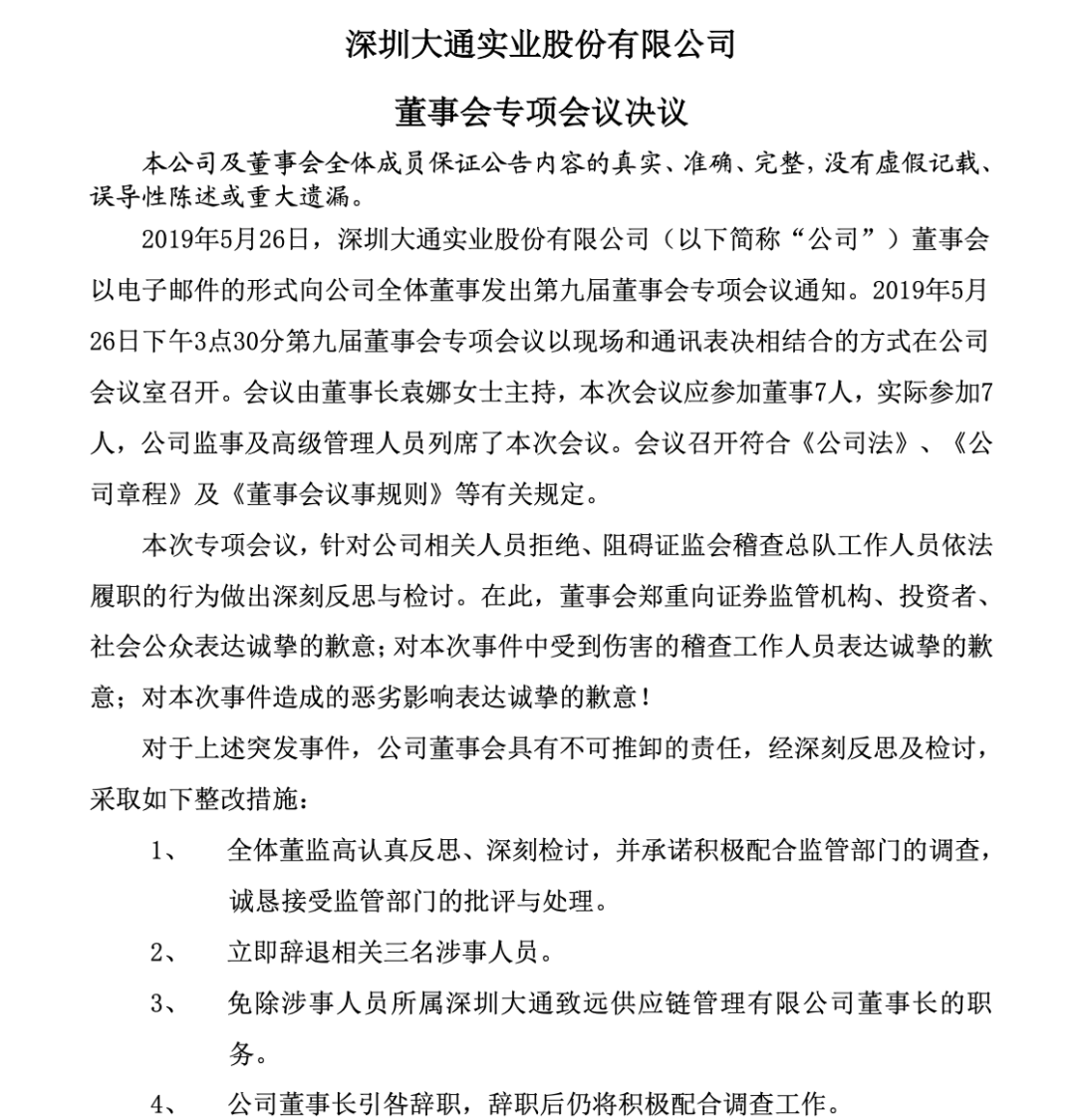 上市公司深大通2019年5月26日发布公告称,针对公司相关人员拒绝、阻碍证监会稽查总队工作人员依法履职的行为做出深刻反思与检讨。深大通表示,“公司董事长引咎辞职,辞职后仍将积极配合调查工作;立即辞退相关三名涉事人员;免除涉事人员所属深圳大通致远供应链管理有限公司董事长的职务。”