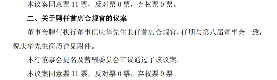 第八届董事会2025年第二次临时会议决议公告显示,董事会审议通过决定聘任执行董事倪庆华先生兼任首席合规官。