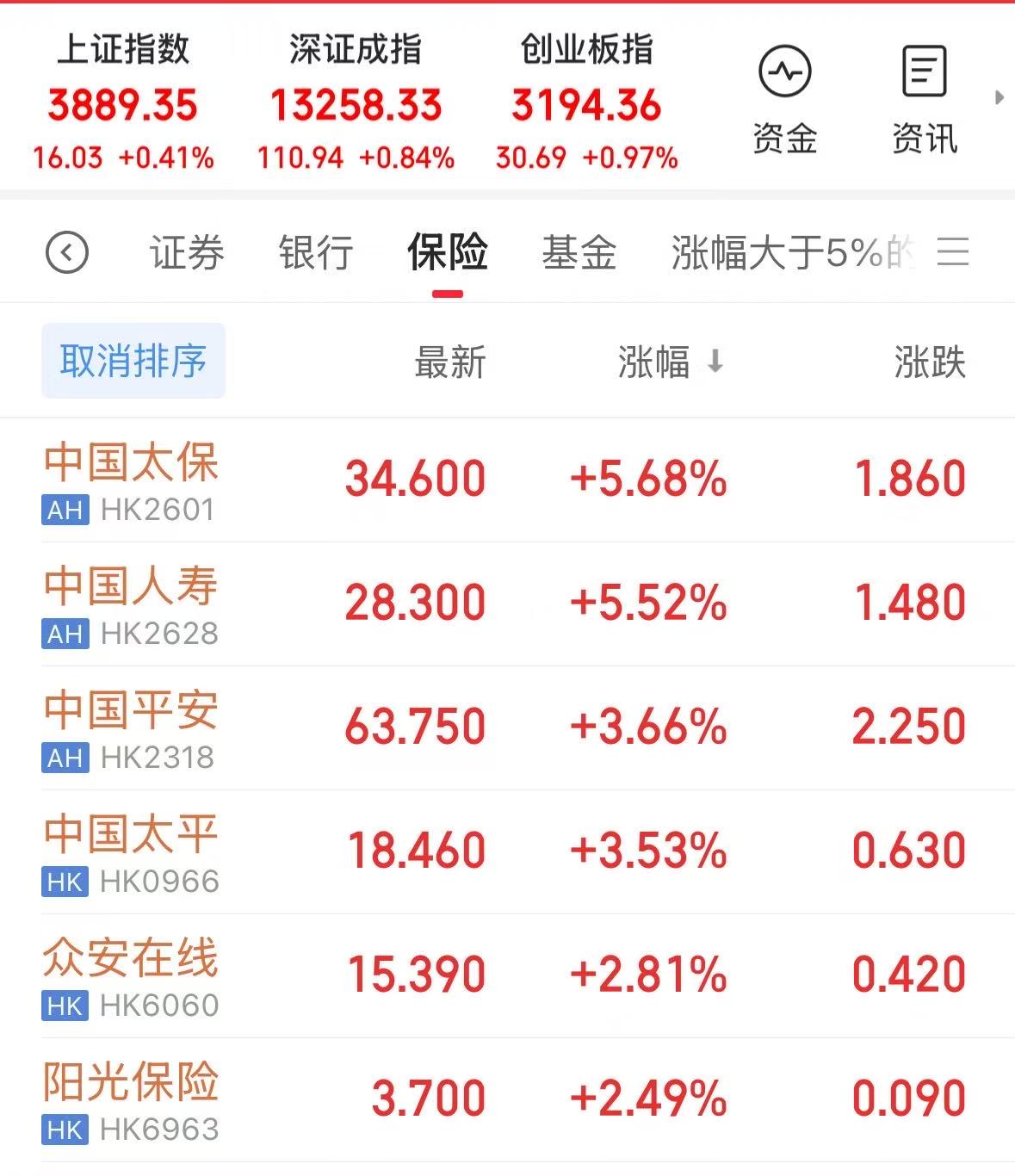 12月12日,港股保险股上涨,截至收盘,中国太保(601601.SH)和中国人寿(601628.SH)分别涨5.68%、5.52%。中国平安(601318.SH)和中国太平(00966.HK)也涨超3%。