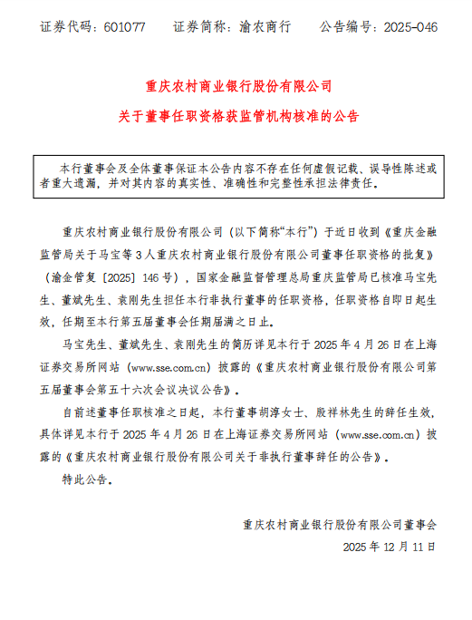 12月11日,重庆农村商业银行股份有限公司发布关于董事任职资格获监管机构核准的公告,国家金融监督管理总局重庆监管局已核准马宝先生、董斌先生、袁刚先生担任本行非执行董事的任职资格。