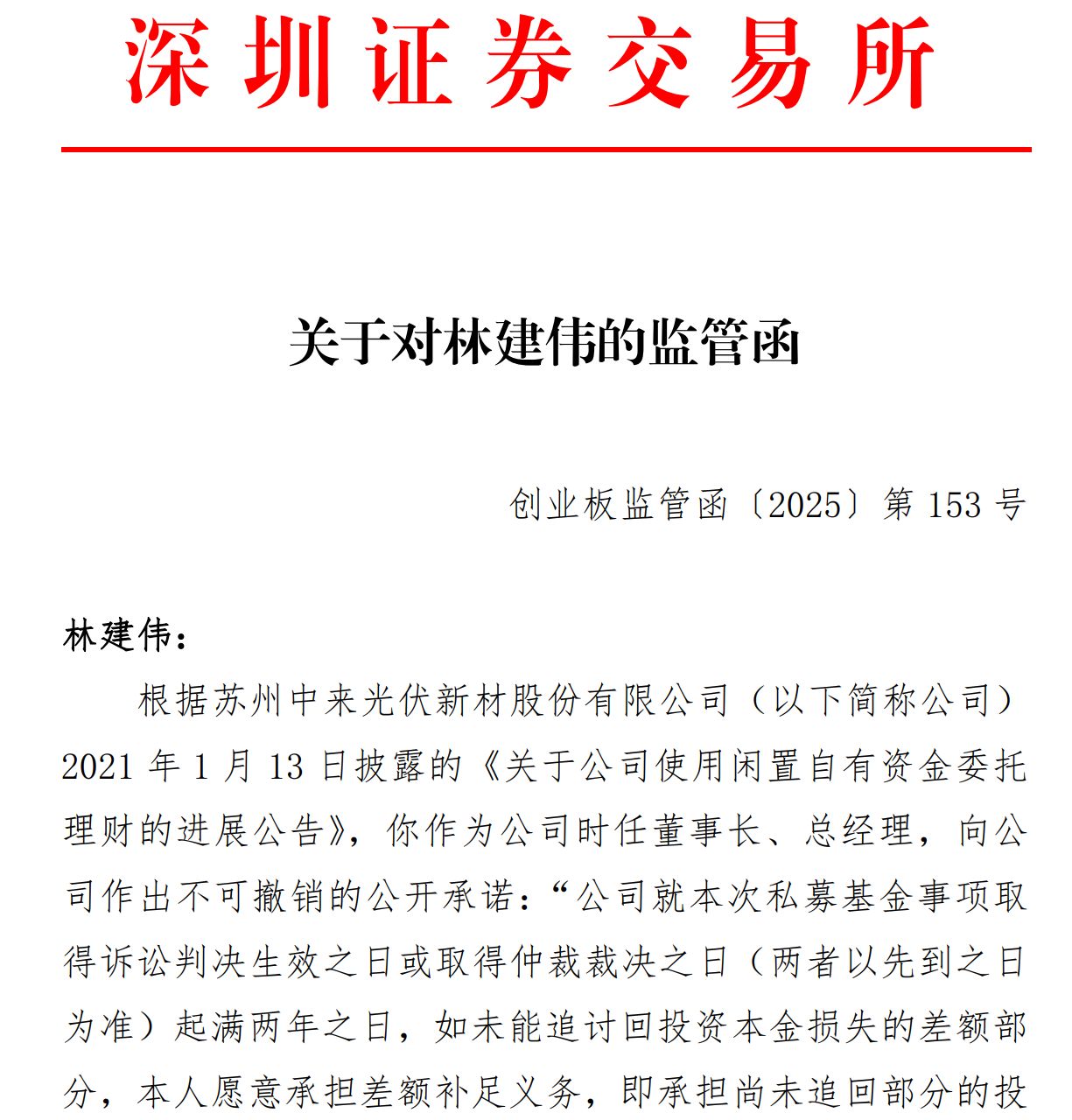 据监管函,林建伟作为中来股份时任董事长、总经理,于2021年1月13日公开承诺,若公司在私募基金相关诉讼或仲裁判决生效满两年后仍未追回投资本金损失,其将对差额部分承担补足义务,并在3个月内支付。
