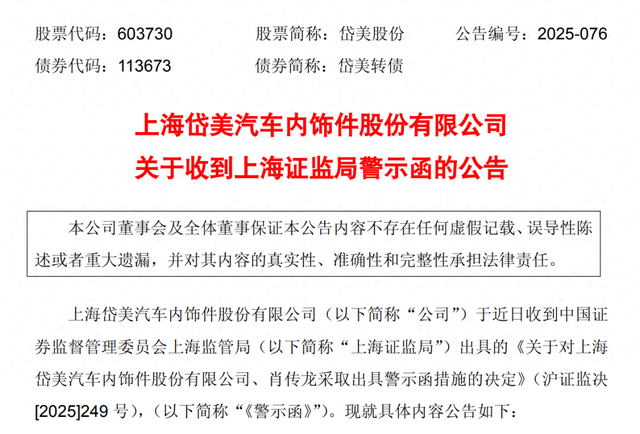 岱美股份12月12日盘后公告,公司于近日收到上海证监局出具的《关于对上海岱美汽车内饰件股份有限公司、肖传龙采取出具警示函措施的决定》(沪证监决〔2025〕249号),(以下简称《警示函》)。