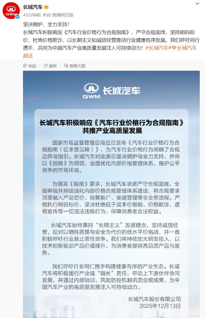 同日,长城汽车发文称,积极响应《汽车行业价格行为合规指南》,严守合规底线,坚持明码标价,杜绝价格欺诈,以长期主义和诚信经营推动行业健康有序发展。长城汽车承诺严守合规底线,全面审视井持续强化内部价格合规管理体系建设,将合规要求深度融入产品定价、销售推广,渠道管理等全业务流程。严格执行明码标价,坚决杜绝低于成本价倾销、价格欺诈、虚假宣传等一切违法违规行为,保障消费者合法权益。