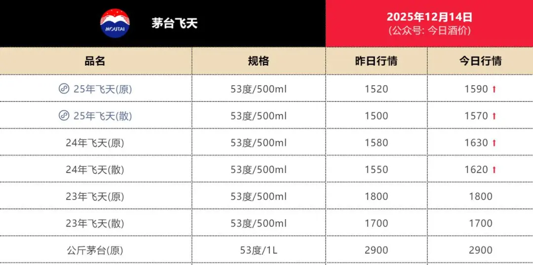 第三方平台“今日酒价”披露的各大名酒批发参考价显示,12月13日,25年飞天散瓶(53度/500ml)的批发参考价较前一日上涨20元,报1500元/瓶;25年飞天原箱较前一日上涨25元,报1520元/瓶。12月14日,25年飞天散瓶批发参考价报1570元/瓶,25年飞天原箱报1590元/瓶,均较前一日上涨70元。【此前报道:茅台大手笔“护盘”!渠道商称“已不再接手了”?】