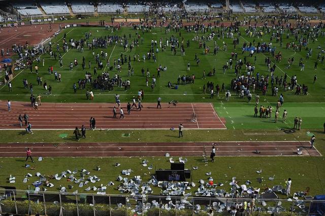 梅西离场几分钟后,人群还涌入盐湖体育场中心区域,场内搭建的临时建筑和帐篷遭到破坏。