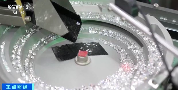 在广西梧州的一家莫桑石裸石的生产企业,记者看到,几百台自动化生产设备正在全速运转。经过机器的打磨、切割等工序,一颗颗晶莹璀璨的裸石便制作完成。生产负责人告诉记者,这段时间工厂非常忙碌,因为订单要赶在新年到来前发往海外市场。