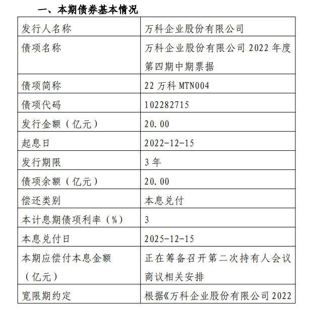 公告称,根据《万科企业股份有限公司2022年度第四期中期票据募集说明书》中关于违约事件的约定,对未能按期足额偿付债务融资工具本金或利息的违约情形设置了5个工作日的宽限期。宽限期内应以当期应付未付的本金和利息为计息基数、按照票面利率上浮5BP 计算并支付利息。
