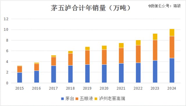 与上文中,白酒过去10年掉60%销量不同,高端白酒的代表,茅台,五粮液,泸州老窖(高端系列)的销量过去10年中涨了200%多,达到了10万吨的水平。