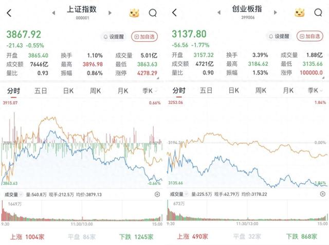 至收盘,上证综指跌0.55%,报3867.92点;科创50指数跌2.22%,报1318.91点;深证成指跌1.1%,报13112.09点;创业板指跌1.77%,报3137.8点。