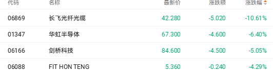 截至收盘,长飞光纤光缆(06869.HK)跌10.61%、剑桥科技(06166.HK)跌5.05%、京信通讯(02342.HK)跌4.49%。