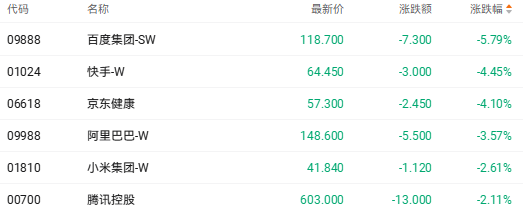 截至收盘,百度集团-SW(09888.HK)跌5.79%、快手-W(01024.HK)跌4.45%、阿里巴巴-W(09988.HK)跌3.57%。