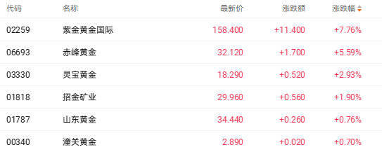 截至收盘,紫金黄金国际(02259.HK)涨7.76%、赤峰黄金(06693.HK)涨5.59%、灵宝黄金(03330.HK)涨2.93%。