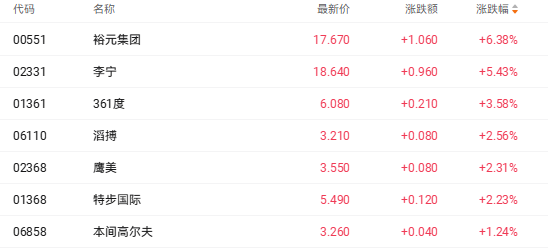 截至收盘,李宁(02331.HK)涨5.43%、361度(01361.HK)涨3.58%、特步国际(01368.HK)涨2.23%。