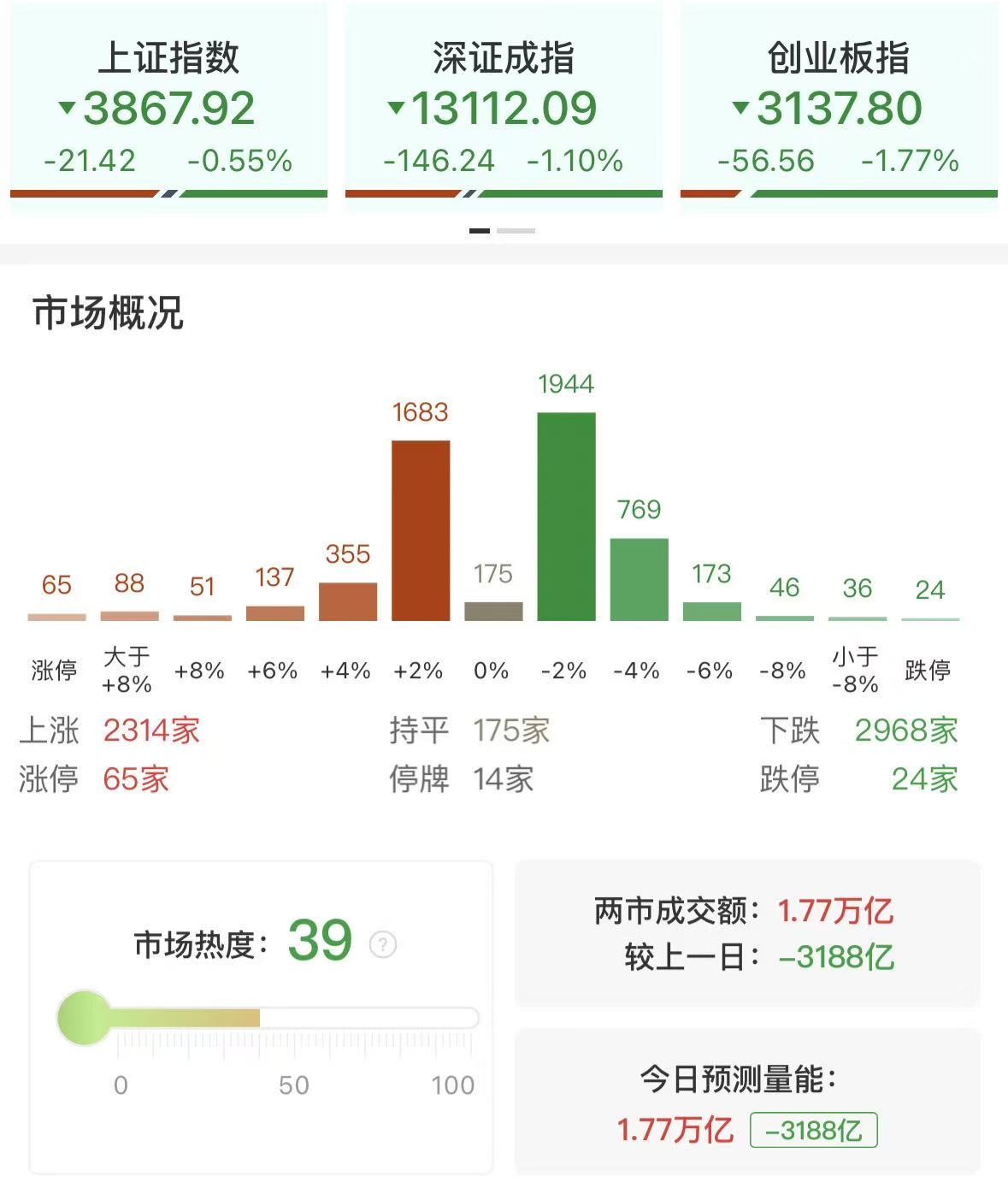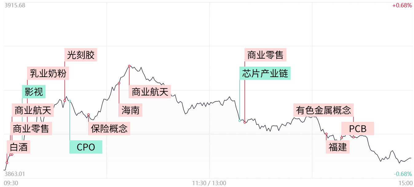 财联社12月15日讯,市场震荡调整,沪指盘中翻红后再度回落,创业板指低开低走。沪深两市成交额1.77万亿,较上一个交易日缩量3188亿。盘面上,市场热点快速轮动,全市场超2900只个股下跌。从板块来看,大消费方向大涨,其中白酒概念开盘活跃,中锐股份2连板;乳业概念快速拉升,皇氏集团、阳光乳业涨停;零售表现强势,百大集团、广百股份涨停。保险板块走强,中国平安涨近5%创4年多新高。商业航天概念延续活跃,华菱线缆、中超控股双双3连板。贵金属板块下午快速拉升,贵研铂业触及涨停。下跌方面,算力硬件概念走弱,长飞光纤触及跌停。截至收盘,沪指跌0.55%,深成指跌1.1%,创业板指跌1.77%。