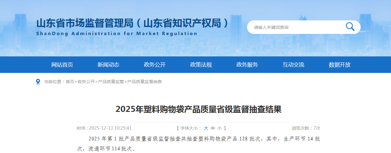 中国质量新闻网讯 据山东省市场监督管理局网站消息,近日,山东省市场监督管理局公布2025年塑料购物袋产品质量省级监督抽查结果。2025年第1批产品质量省级监督抽查共抽查塑料购物袋产品128批次,其中,生产环节14批次,流通环节114批次。