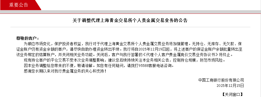 今日下午,工商银行在官网发文称,自2025年12月19日起,将关闭该行代理上金所个人贵金属交易的“三无”客户的相关业务功能,提醒账户仍有余额的客户及时转出。