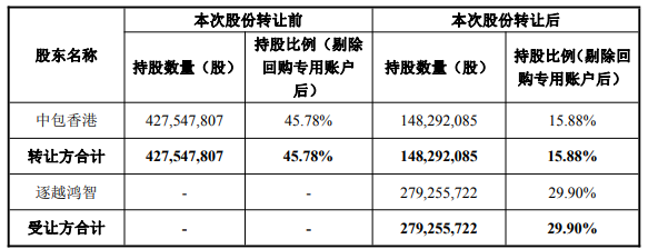 本次股份转让完成及表决权放弃后,逐越鸿智将拥有上市公司29.90%的股份及该等股份对应的表决权,上市公司控股股东将由中包香港变更为逐越鸿智,俞浩将成为上市公司实际控制人。